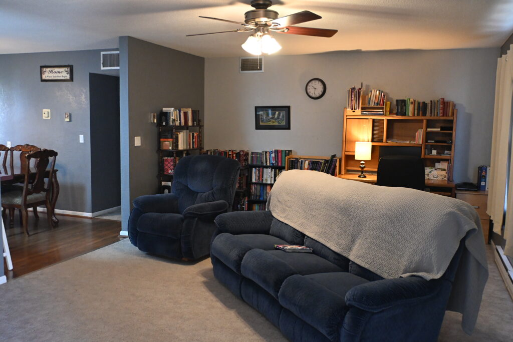 Living Room: 13'6"x 20' carpet, lighted ceiling fan