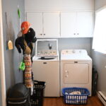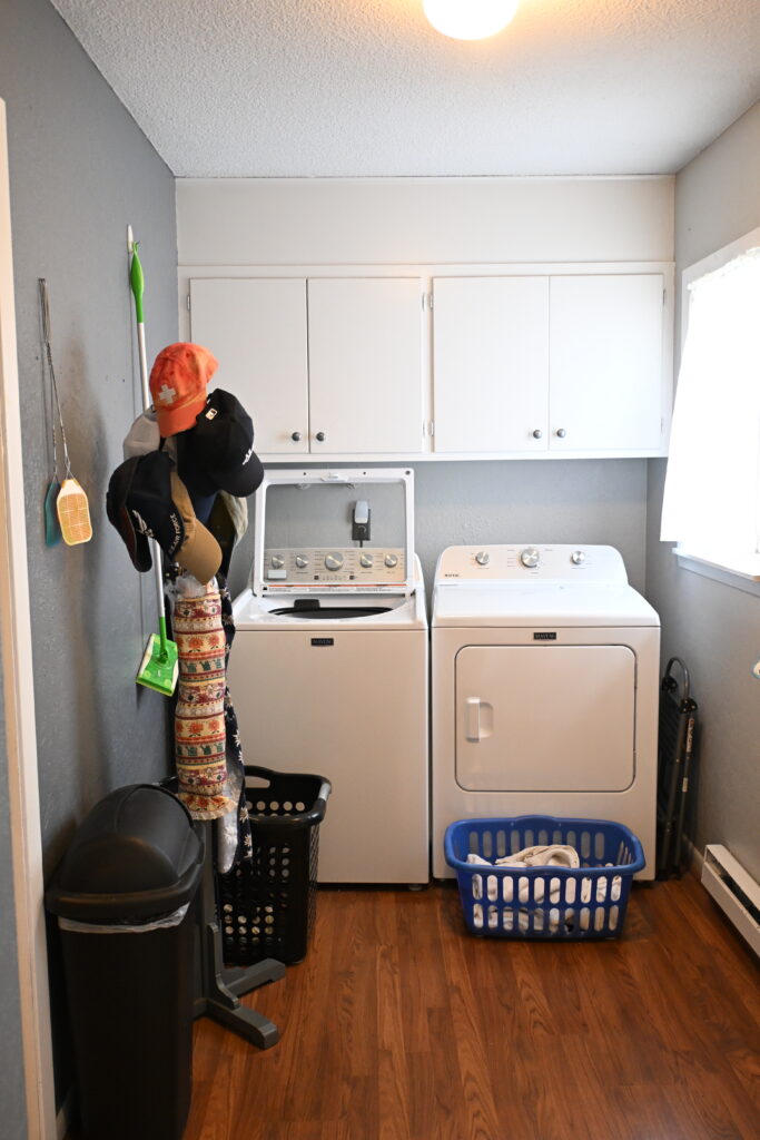 Laundry Room: 5'x 10' wood laminate flooring, Maytag washer and dryer, storage, backyard, basement and garage access