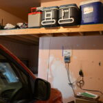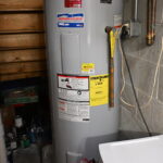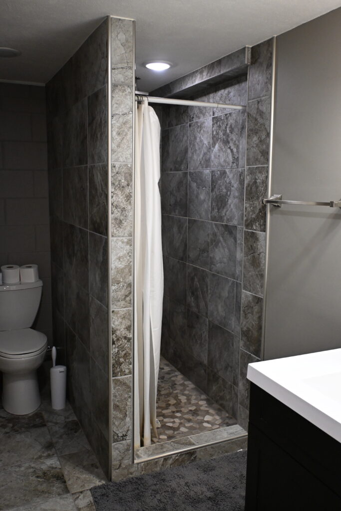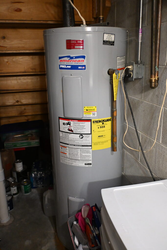 Bathroom: 5'x 10' 3/4 with shower tile floor, water main and additional storage area under staircase with 2017 American 50-gallon electric water heater, Radon mitigation system