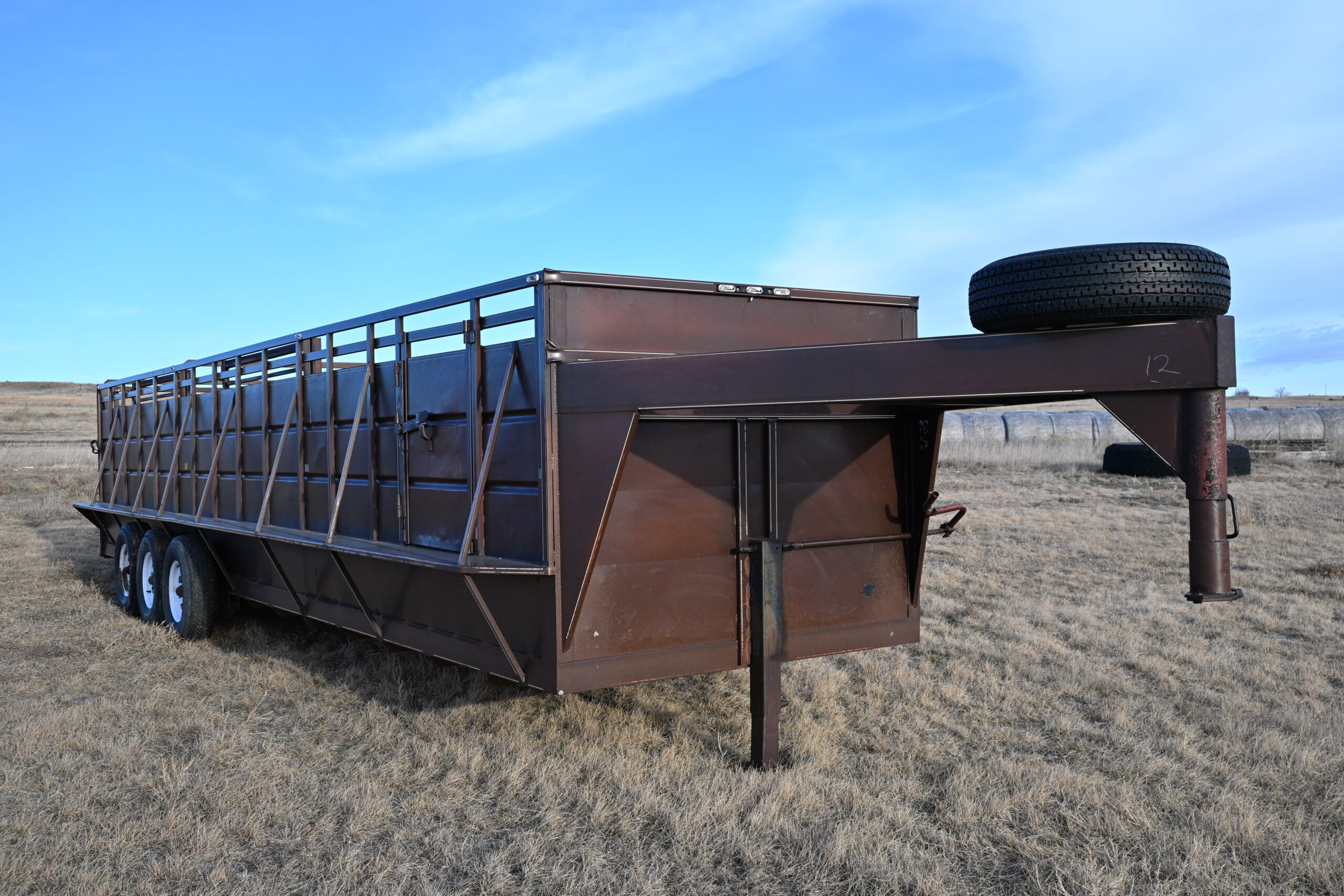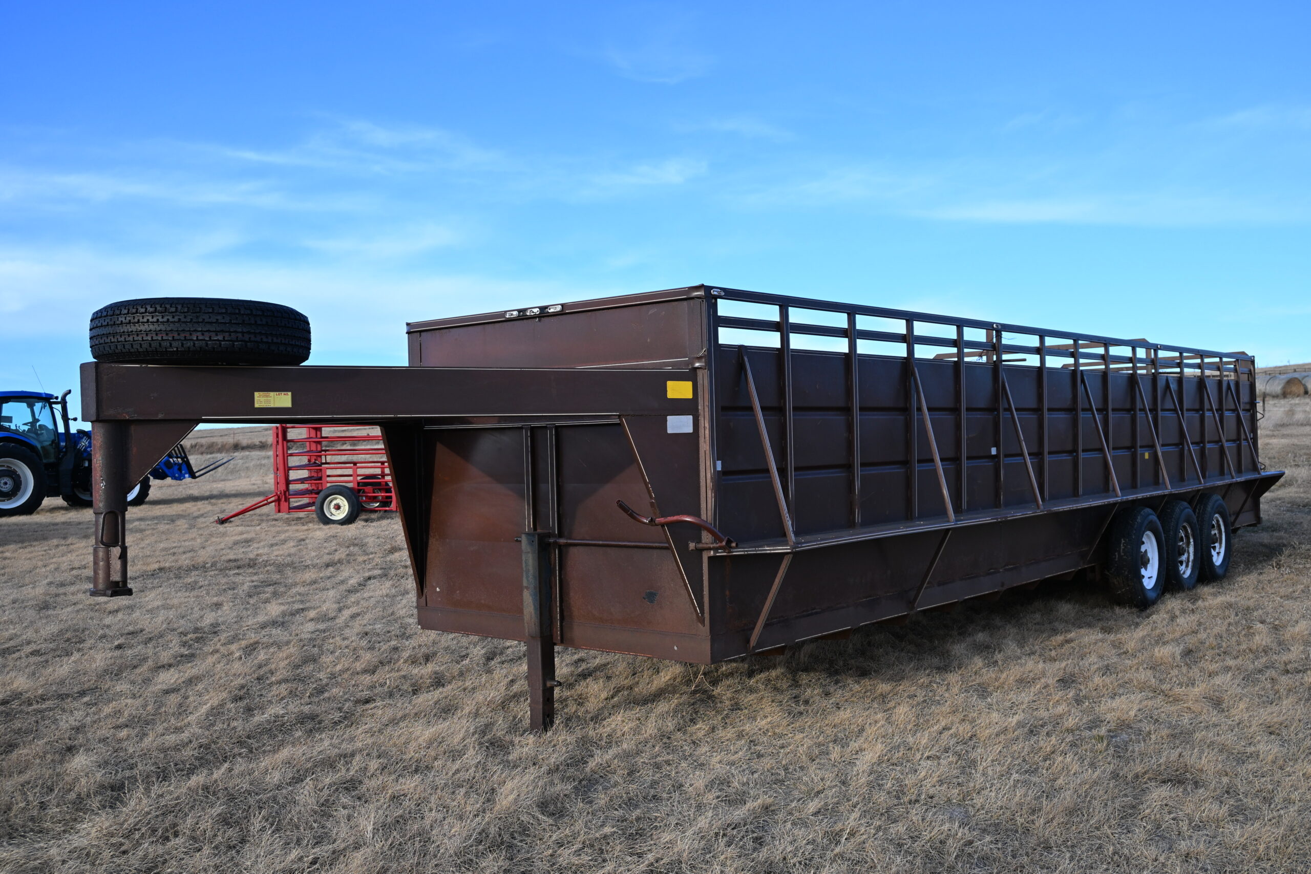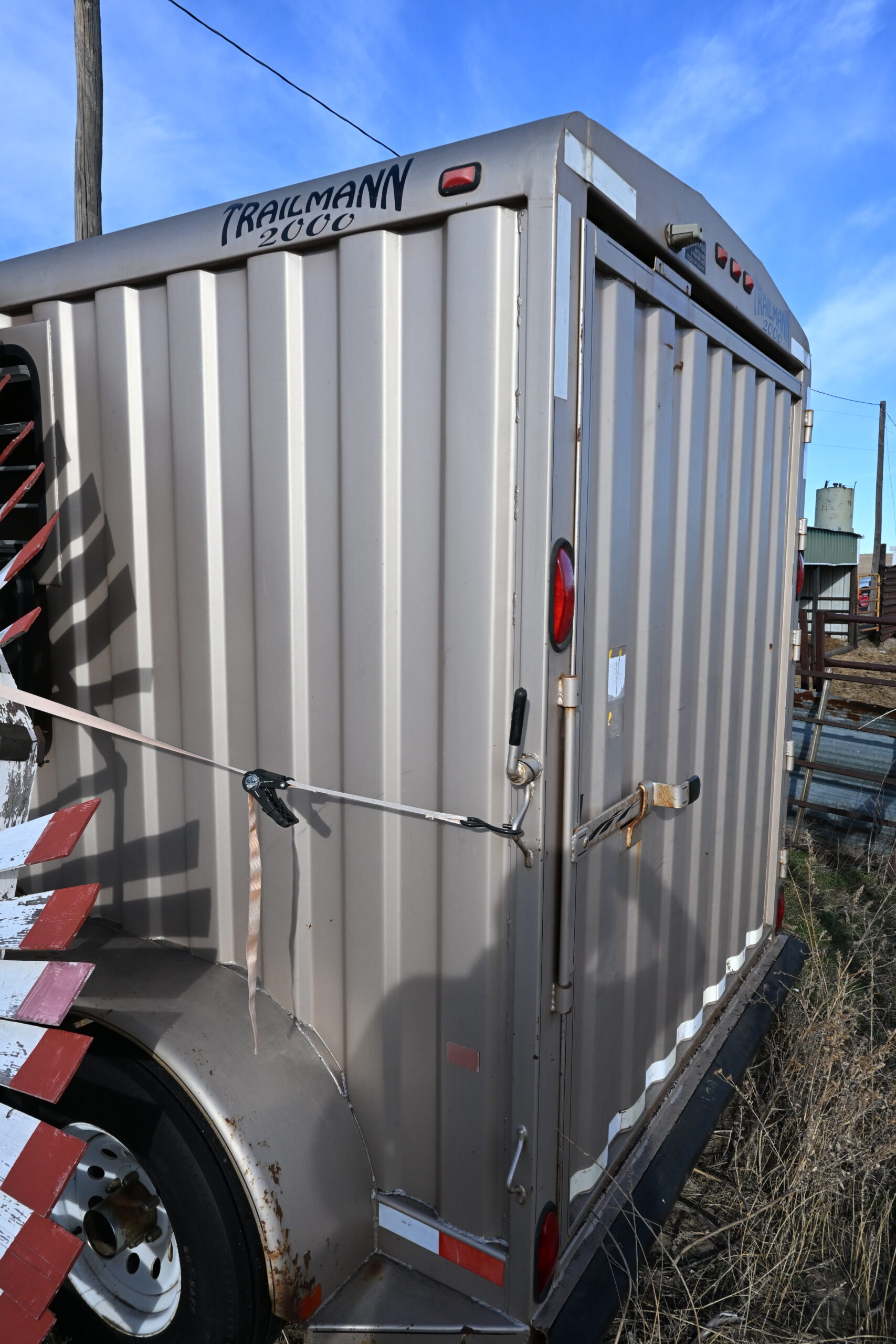 Hay/Livestock/Flatbed Trailers: Industrias American gooseneck bale hauler Model 20X42 2 row tandem duals no title. 12 bale 32’ chain heavy duty gooseneck bale hauler. 2012 50’ Merritt livestock trailer 2 duals 1 tag axles upper doghouse in back double deck front with ramps #MT2N5330CH022394.32’ metal stock rack slides up on a 32’ gooseneck trailer. Trailmann 31’ gooseneck no top livestock trailer 3-7K axles #1M9LA3039K1328162. 2001 Trailmann Saratoga 2 horse slant bumper hitch w/ saddle compartment #1M9MA251152440. 30' TrailMax TD42T hd tilt trailer air brakes. 20' gooseneck utility trailer.