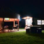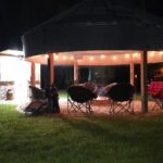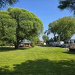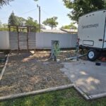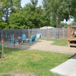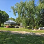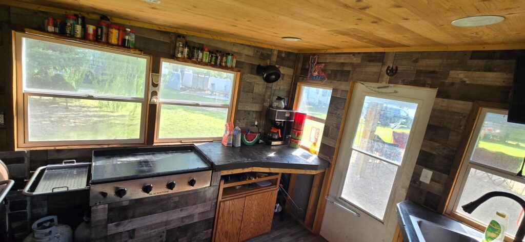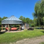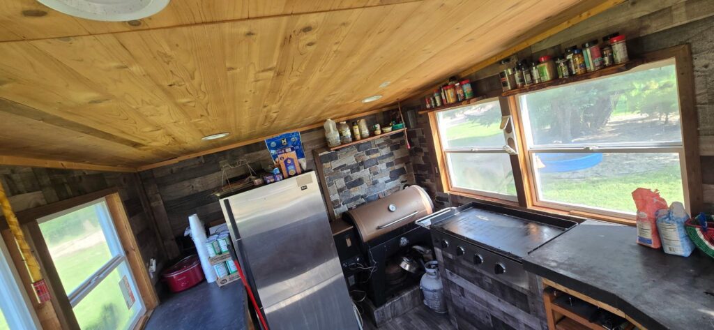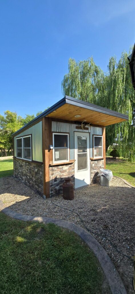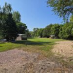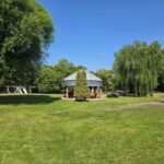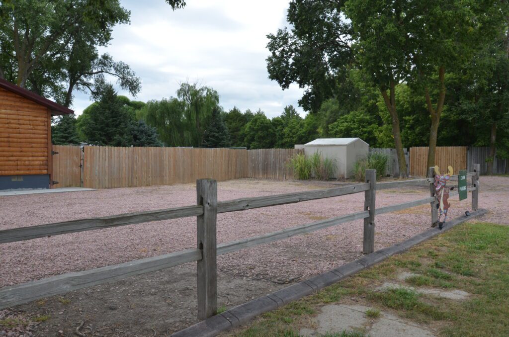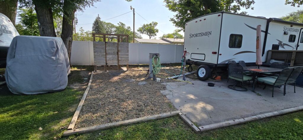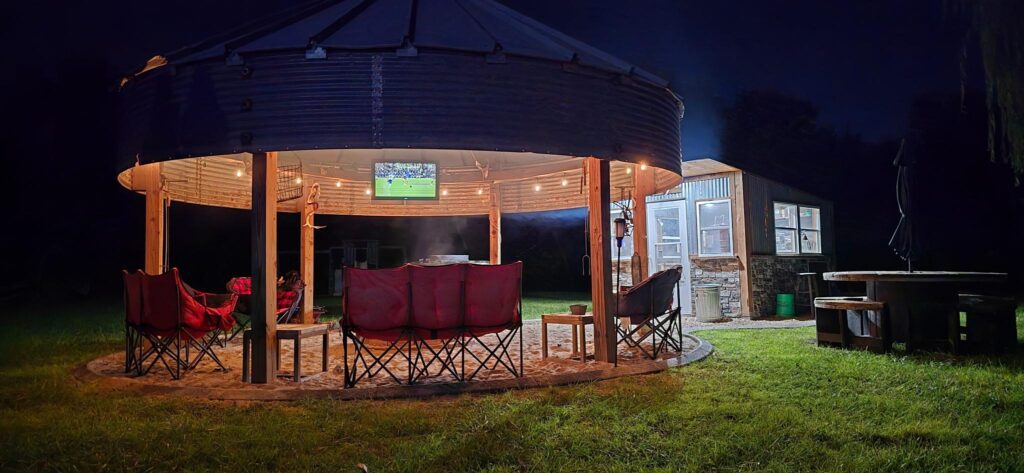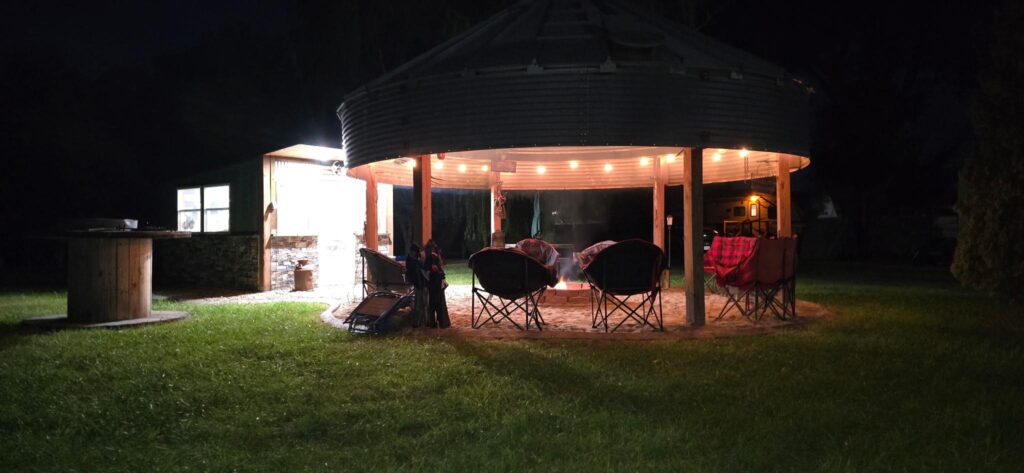 Separate Large Fenced-In & Private Backyard With Many Amenties Including : swing through gate, garden shed, 4 camper hook-ups with 50, 30, and 20 amp electricity, sand shower, shared water hydrants, swing set, sand area, shade trees, outdoor living space made from a 22 1/2' grain bin top on posts with tv, gravel and fire pit, small building for your cooking needs that has griddle, pellet grill, refrigerator, sink, concrete countertops and tv