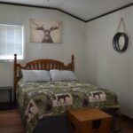 Bedroom: 8'6"x13', laminate wood flooring, lighted ceiling fan, wall mounted TV, 5'x4' walk-in storage closet, 200 amp breaker box