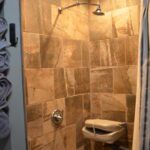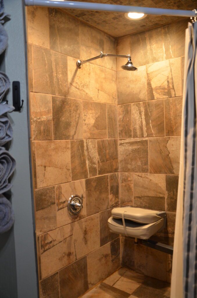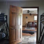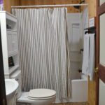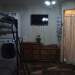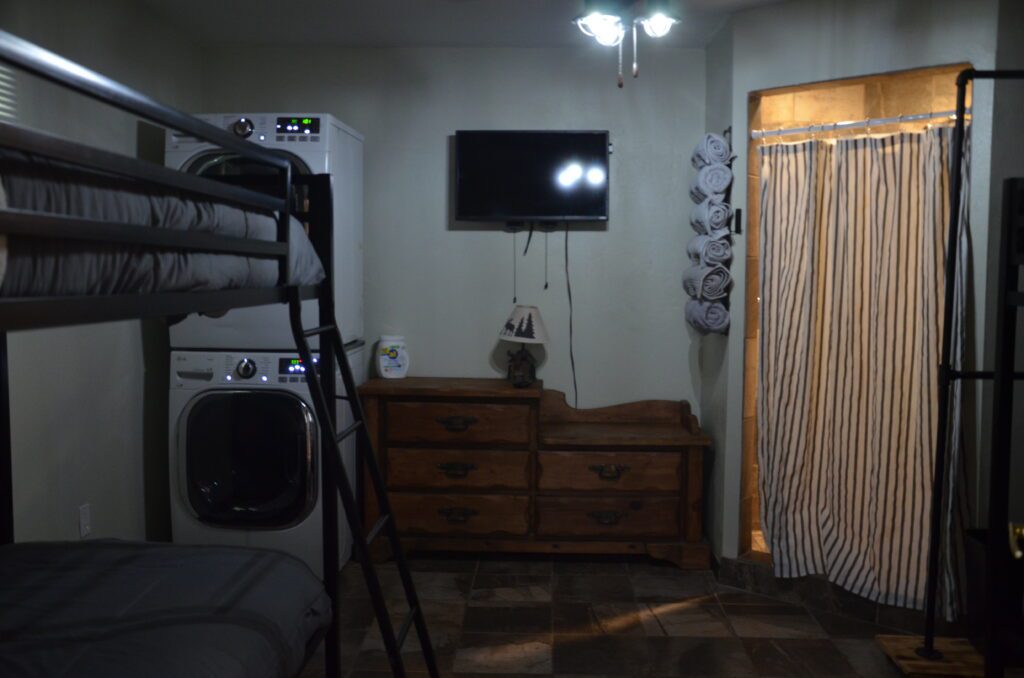 Bedroom: 13'6"x13', tile floor, lighted ceiling fan, wall mounted TV, LG stacker washer & dryer, bunk beds, handicap tiled shower