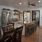 Eat-in Kitchen: 14'x25', laminate flooring, 2 lighted ceiling fans, wall mounted TV, 4 person breakfast bar w/storage, Kenmore refrigerator, double sink, Whirlpool dishwasher, Amana stove, Frigidaire microwave, recessed lighting, back door to 11'x10' back wood deck