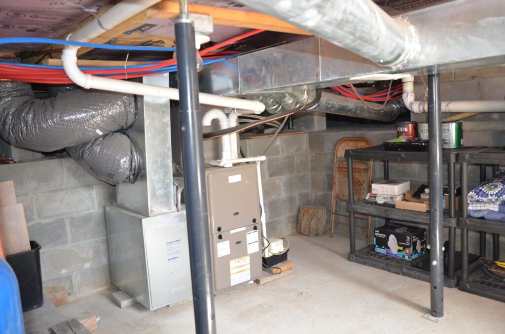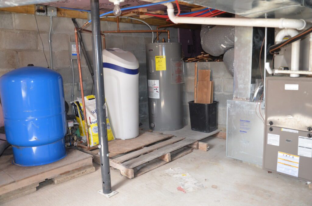 Concrete Foundation to Crawlspace: propane furnace, Luxaire central air conditioning, Richmond 40 gallon electric water heater, water softener, pressure tank
